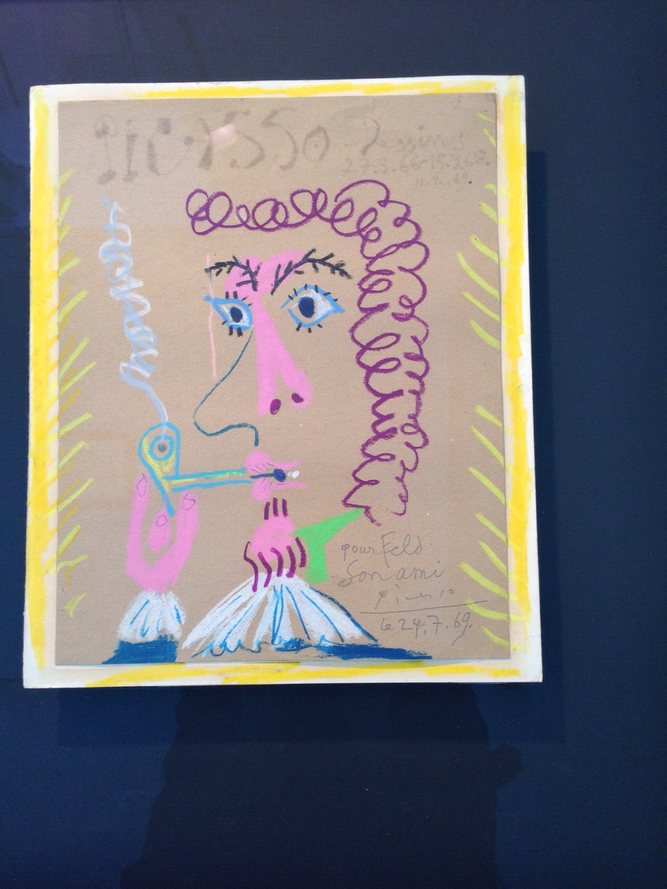 There are also several works on paper and a number of portraits Picasso did using “aquatint,”a process of etching tonal values, which can create a look like ink or watercolor washes. One amusing piece was not within the “femmes” theme but part of a series of portraits Picasso did of smokers. This crayon and felt tip pen portrait looked like something a school child would draw. Nonetheless, it had a distinct Picasso feel to it. If you’re a Picasso fan then this is a show worth visiting. It will be on view through June 30th at the gallery in the Crown Building (730 Fifth).